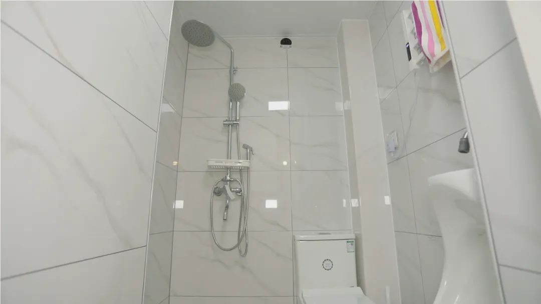 衛(wèi)生間——移動(dòng)墻體,增加衛(wèi)生間面積,將洗手盆外移,合理規(guī)劃了淋浴、坐便區(qū),實(shí)現(xiàn)了干濕分離。