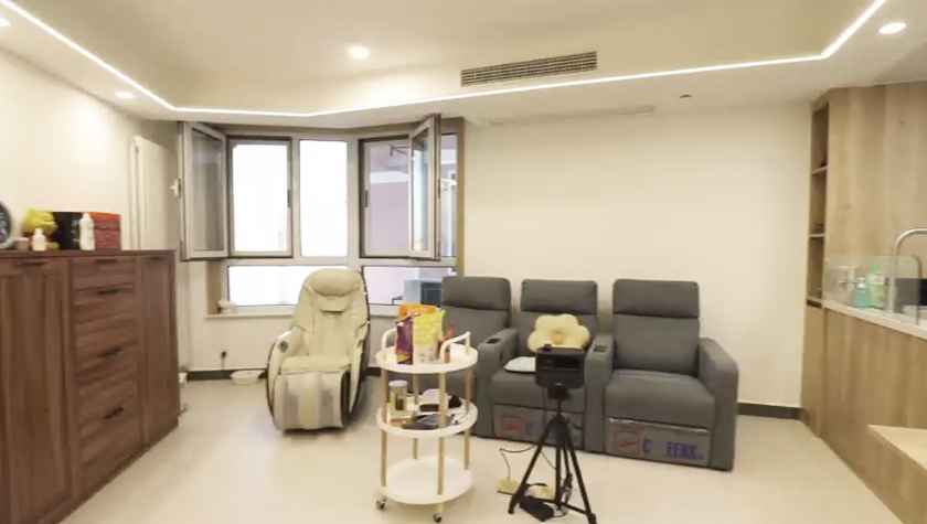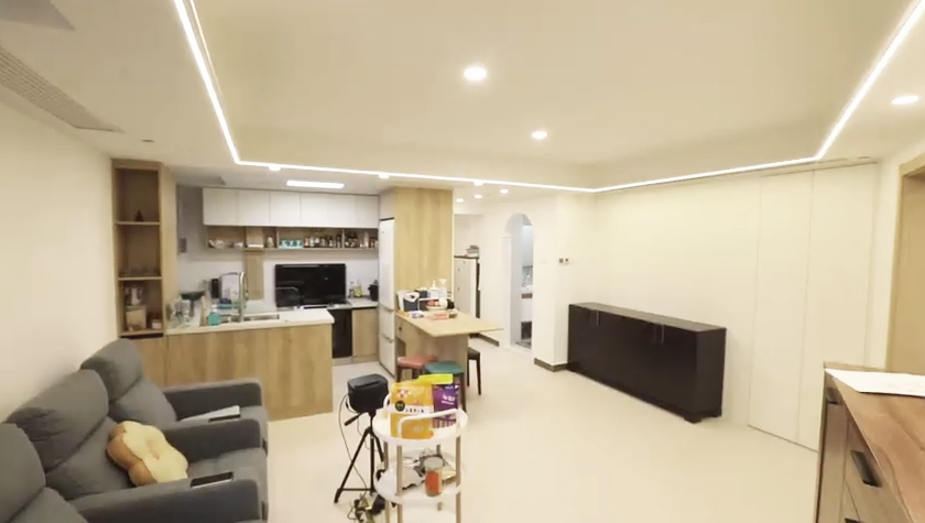 設(shè)計(jì)師將原來餐區(qū)的位置規(guī)劃了一個(gè)儲(chǔ)藏間,為了與客廳更好的融合,儲(chǔ)藏間的門,用柜體做成了隱形門,投影隱藏在這面墻上面,家里實(shí)現(xiàn)了投影的設(shè)計(jì)。