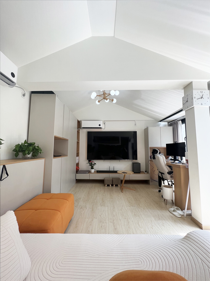 利用定制家具在入戶門規(guī)劃了一組換鞋柜,背面與辦公桌相連,靠窗位置規(guī)劃為辦公區(qū),順著電視柜轉(zhuǎn)過來,靠墻放了一整面墻的儲(chǔ)物柜,可放衣服、大件物品等,這個(gè)柜子里面還隱藏了一個(gè)壁床,可作為臨時(shí)居住的地方。