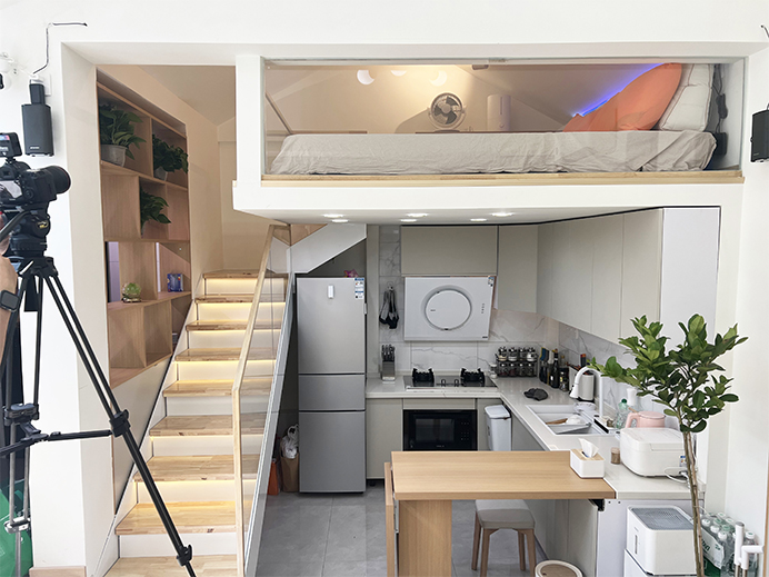 設(shè)計(jì)師將原來的臥室規(guī)劃為了廚房,利用平房尖屋頂?shù)奶攸c(diǎn),從頂?shù)降孛娓叨扔?米,上面留1米8規(guī)劃為了臥室,下面留2米作為廚房,廚房現(xiàn)在面積達(dá)到7.8平米。
