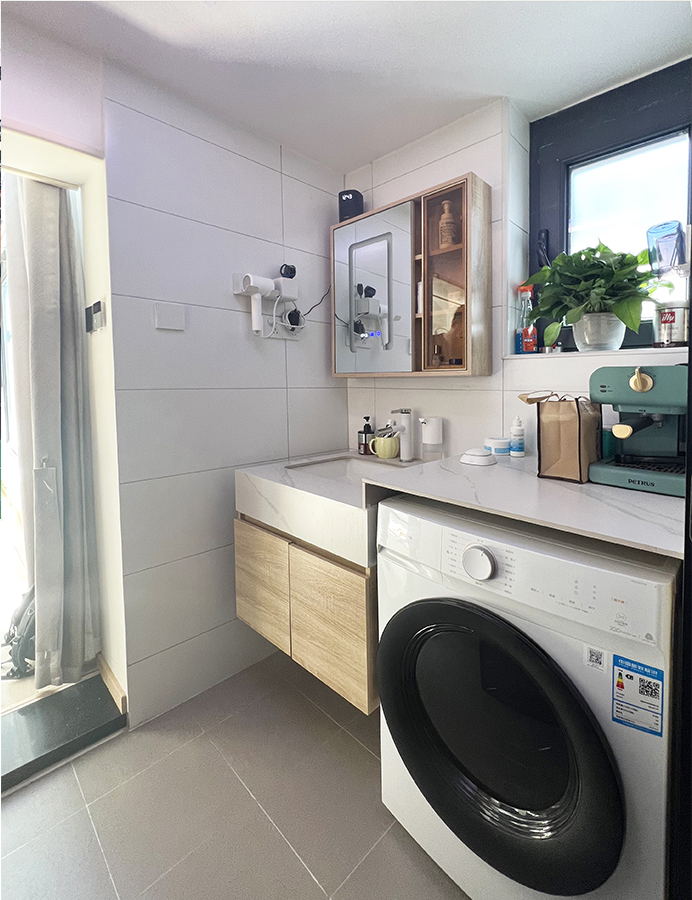 衛(wèi)生間里面能實(shí)現(xiàn)1米2的獨(dú)立淋浴空間、并放下馬桶;外面干區(qū),定制浴室柜、鏡箱,臺(tái)面上方有足夠空間放置洗漱用品,臺(tái)面下方嵌入了洗衣機(jī)。