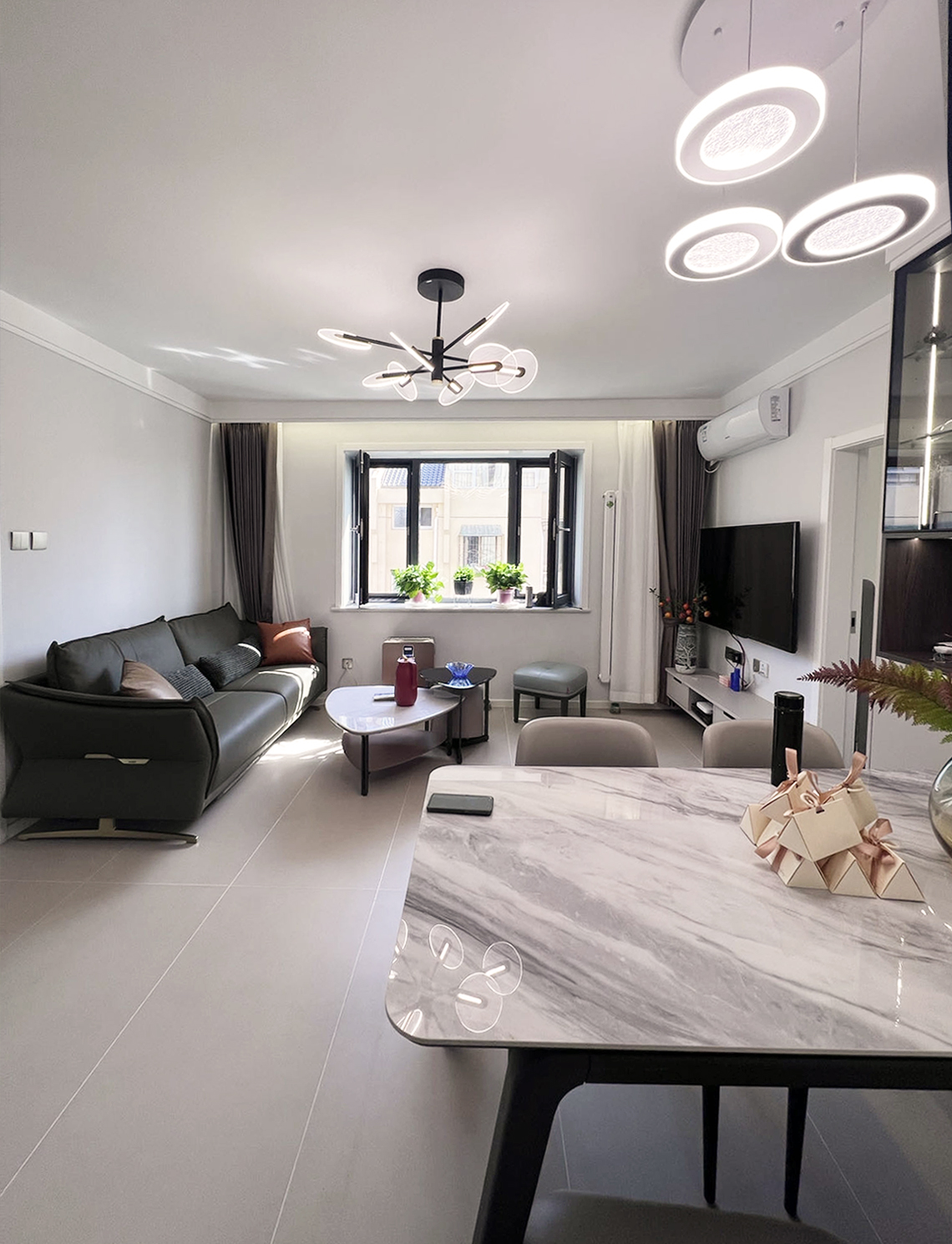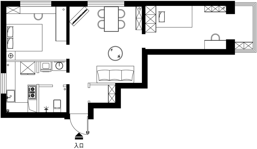 客廳進(jìn)行了重新布局,餐區(qū)規(guī)劃在了這里,原來(lái)壁櫥的這個(gè)空間除了規(guī)劃了門(mén)廳鞋帽柜之外,剩余的這部分空間規(guī)劃了冰箱和餐邊收納。而且餐區(qū)規(guī)劃在這里,距離廚房也更近,行走路徑最短,也更加合理。而剩余的空間則規(guī)劃了一個(gè)完整的客廳,布局優(yōu)化后,生活起來(lái)更加舒適。