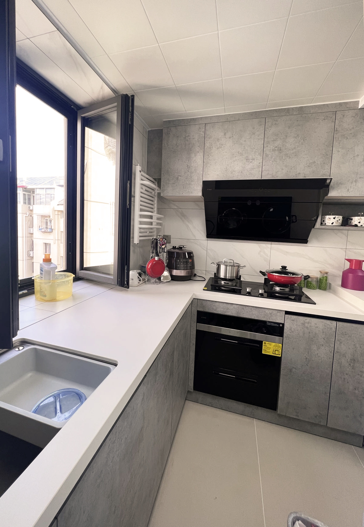 拆掉廚房的推拉門(mén),廚房空間得到延展,實(shí)現(xiàn)了U形櫥柜布局,洗切炒的順序更順暢,儲(chǔ)物空間也比原來(lái)加大了。