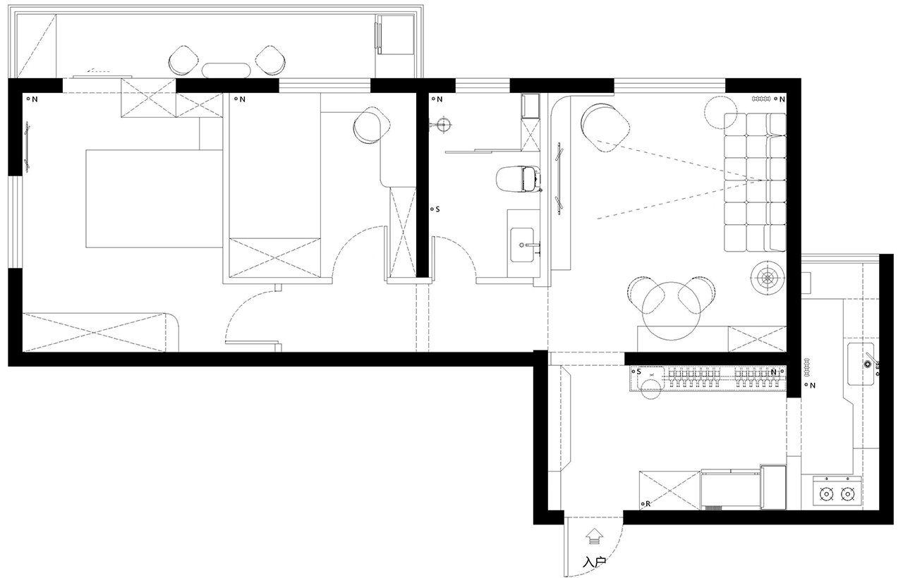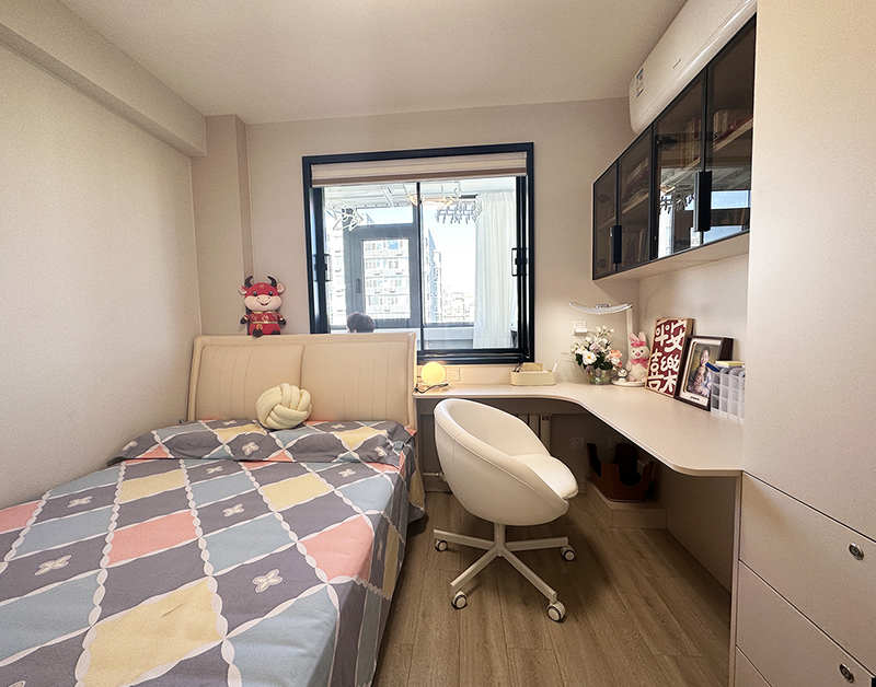 兩間臥室充分利用空間做了沿墻收納,特別是次臥室,門洞往左移了40厘米,這樣一來,門后的空間也利用上了。