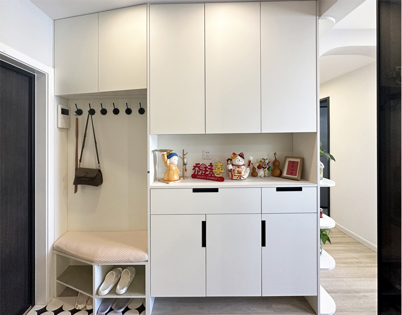 設(shè)計師將門廳和餐廳這兩個區(qū)域的功能融合,在這將近8平米的空間里,集合了換鞋掛衣、冰箱嵌入、西廚、酒柜以及家政柜六大功能,并且,還充分考慮到了水電位置、家居動線等方面,充分滿足了兩位老人對儲物的需求。