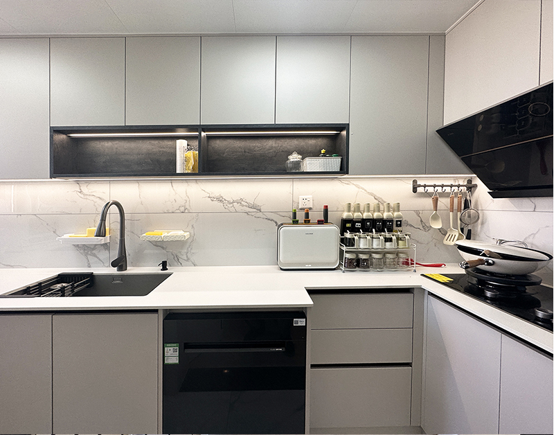 把冰箱移走后,廚房實現(xiàn)了U形櫥柜的布局,儲物問題得以解決,根據(jù)洗切炒等功能區(qū)域的劃分,設(shè)計師把備菜區(qū)的臺面壓縮了20厘米,相應(yīng)的擴展了相鄰炒菜區(qū)的空間,從而滿足了炒菜時對空間的要求。此外,櫥柜的柜體顏色、墻面材質(zhì)都考慮到了日后清潔時的方便,以降低老人家務(wù)勞動的強度。