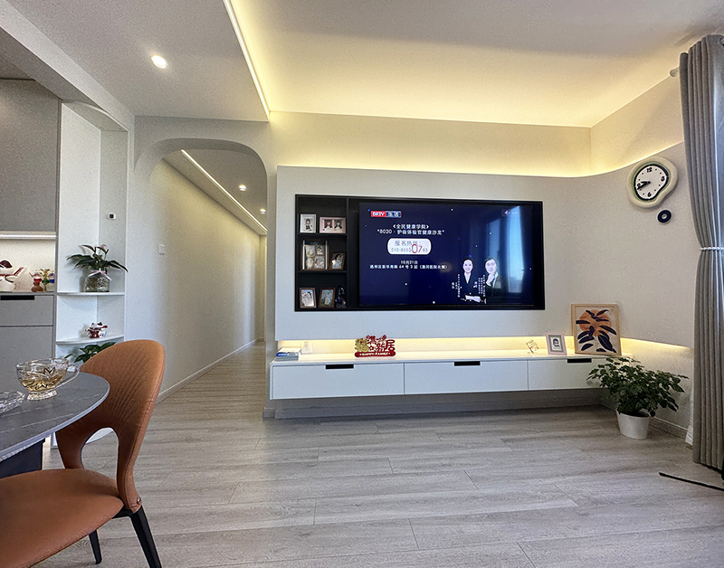 客廳通過定制柜體,依墻制作了卡座沙發(fā)、餐邊柜,實現(xiàn)了餐廳、水吧的功能,既實現(xiàn)了儲物功能,還不過多占有空間。電視墻也掛上了大電視,提升了兩位老人的觀影感受,在電視墻造型上設(shè)計師運用了弧形線條,實用美觀。