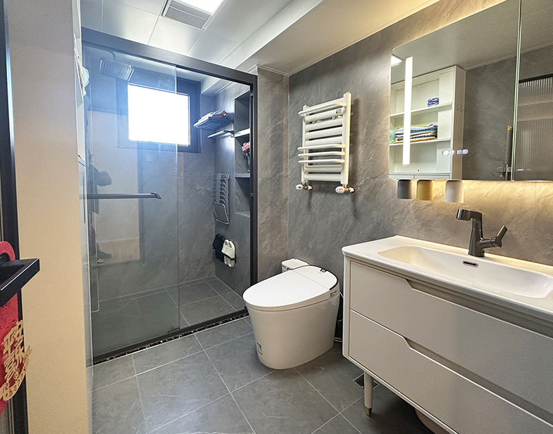衛(wèi)生間通過馬桶移位,實現(xiàn)了淋浴區(qū)的擴大,同時,洗衣機移到陽臺,如廁、洗漱的空間也變得寬敞了,為了方便老年人生活,這次裝修還購置了智能馬桶、智能浴室柜,提升了老人的居住品質(zhì)。